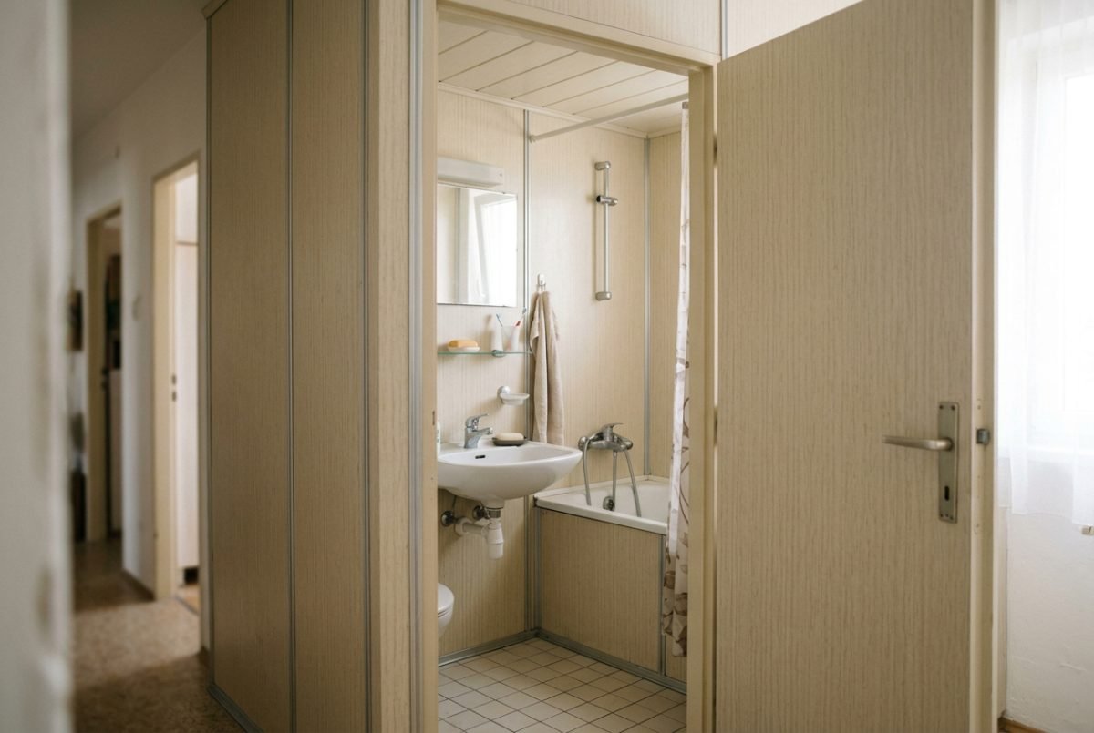Aby sme pochopili, prečo umakart ovládol slovenské panelákové byty, musíme pochopiť koncept bytového jadra. Ide o prefabrikovanú, vopred vyrobenú jednotku — akúsi „kúpeľňovú škatuľu“ — ktorá sa do bytu jednoducho vsadila. Kúpeľňa, WC, niekedy aj časť predsiene — to všetko tvorilo kompaktný modul, ktorý sa dal vyrobiť v továrni a na stavenisku len osadiť.